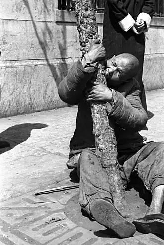 ![]() Famine victim crazed with hunger gnaws bark from tree, 1942. | |