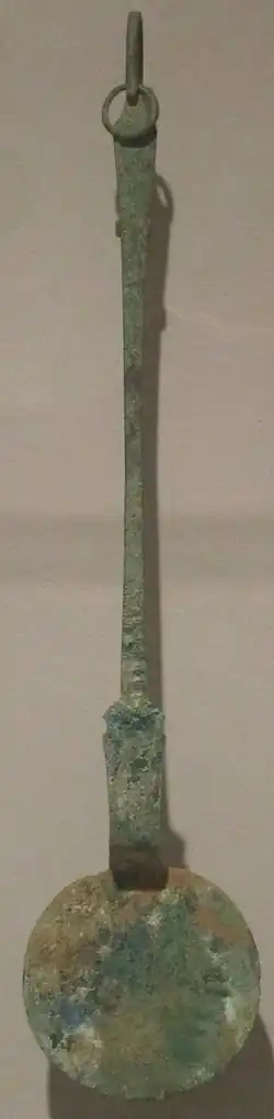 The spoon (匕, bǐ) was known as early as the Shang dynasty. The earliest found were made of bone, but bronze specimens are also found that have sharp points, suggesting they were used for cutting. These could be more than a foot long. During the Spring and Autumn period a rounder form appeared, and lacquer spoons are also found, becoming popular in the Han dynasty.[2]