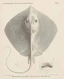 The Chinese stingray was originally described as Trygon sinensis by Austrian Franz Steindachner, in an 1892 volume of the scientific journal Denkschriften der Mathematisch-Naturwissenschaftlichen Classe der Kaiserlichen Akademie der Wissenschaften in Wien.[2] The type specimen is a male 38 cm (15 in) across, collected from Shanghai, China.[3]