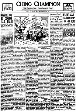 - ^ "Congratulatory Message Sent by Former Editor," Chino Champion, November 11, 1927, page 6