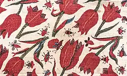 Chintz (/tʃɪnts/[1]) is a woodblock printed, painted, stained or glazed calico textile that originated in Golconda (present day Hyderabad, India) in the 16th century.[2][3] The cloth is printed with designs featuring flowers and other patterns in different colours, typically on a light, plain background.