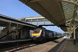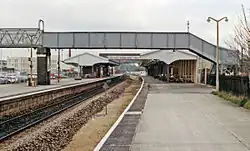 There are two footbridges at the station, although until 2016 one only carried a right of way over the railway. This bridge was replaced with a new one providing steps and lifts on both platforms, opening in January 2016.[15][16][17] This work was funded under the Department for Transport's Access for All scheme, although in any case the bridge required replacement as part of the project to electrify the Great Western main line, as it was too low for the overhead wires to fit underneath. The footbridge was closed for two weeks in September 2016, eight months after opening, due to drainage issues.[18] It had also been criticised as no lift was provided to the car park to the north of the station, although provision was made for its installation in the future. In 2022, work to install the third lift began.[19][20]