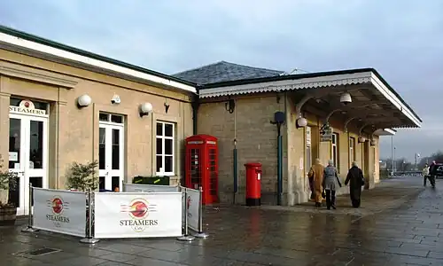 Beside the station is a Grade II listed K6 Red telephone box.[21] In the old station yard to the south of the railway (now a car park) there is a Grade II listed Brunel-designed stone-built office.[22] In the northern station yard (also now a car park) is another Grade II listed building, partly in random stone but mainly weather-boarded on a timber frame with a pitched slate roof. It is an early weighbridge house and coal merchant's office dating from around 1840, and may have belonged to Rowland Brotherhood's engineering works.[23] The Grade II* listed Chippenham viaduct, also designed by Brunel, is detailed below.