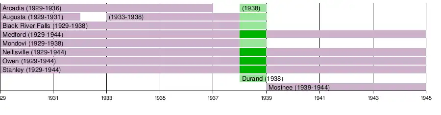 The Chippewa-Black River Valley Conference was founded in 1929 by eight high schools in close proximity to the Black River and Chippewa River in western Wisconsin: Arcadia, Augusta, Black River Falls, Medford, Mondovi, Neillsville, Owen and Stanley.[1] All member schools belonged to conferences which did not sponsor football at the time of its formation and grouped together to promote regular interscholastic competition. Aside from a few interruptions in membership, the conference's roster stayed stable for the first eight years of its existence. In 1938, Durand was welcomed as a new member of the conference, and along with Arcadia's return after a one-year hiatus, the Chippewa-Black River Falls Conference stood at nine members.[2] A new alignment also debuted for the 1938 season that saw the members partitioned into eastern and western divisions:[3]
