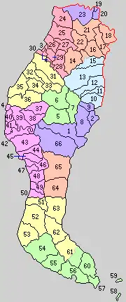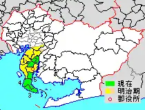 * yellow - areas formerly within the district borders during the early Meiji period