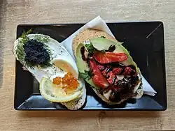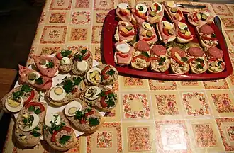 Chlebíček is a type of open sandwich.[4] It consists of sliced bread that has butter or another kind of spread on it, atop which a variety of toppings may be added. Toppings used on chlebíček include various cured meats such as ham, salami and sausage, sliced hard-boiled egg, cheeses, cream cheese, cucumber, tomato, fish paste, salads and various spreads prepared with meat, vegetables or cheeses.[1][2] Some vegetables such as bell pepper, pickle, tomato, radish and parsley may be used as a garnish.[3] Veka or baguette bread may be used in their preparation.[1][5] They are sometimes sold as a snack food at food stalls during festivals and in bars.[1][5]