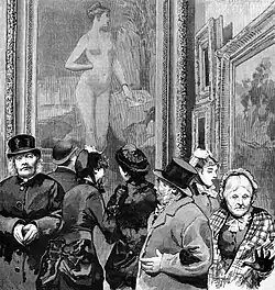 Chloé was then purchased by Dr Thomas Fitzgerald of Lonsdale Street, Melbourne, for 850 guineas.[4] In 1883, Fitzgerald loaned the painting to the National Gallery of Victoria, which had recently opened on Sundays for the first time. As the only full female nude on display at the gallery, Chloé drew criticism from advocates of Sabbatarianism, so it was taken down after only three weeks.[5][6] In response, members of the bohemian artists' society, the Buonarotti Club, protested to the press, including artist Alexander Colquhoun, who wrote satirical verse urging the gallery to rehang the painting.[7]