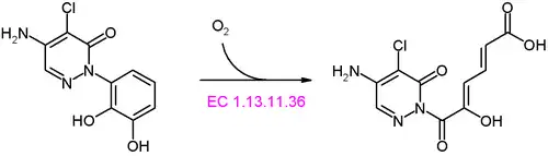 • Muller R, Schmitt S, Lingens F (1982). "A novel non-heme iron-containing dioxygenase. Chloridazon-catechol dioxygenase from Phenylobacterium immobilis DSM 1986". Eur. J. Biochem. 125 (3): 579–84. doi:10.1111/j.1432-1033.1982.tb06722.x. PMID 6811270.