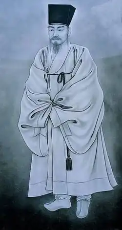 He was framed with charges of factionalism by the power elite that opposed his reform measures and was sentenced to drink poison in the Third Literati Purge of 1519.[1] He has been widely venerated as a Confucian martyr and an embodiment of "seonbi spirit" by later generations in Korea. Some historians consider him one of the most influential figures in 16th century Korea. He is known as one of the 18 Sages of Korea (동방18현) and is enshrined in the Munmyo.[2]