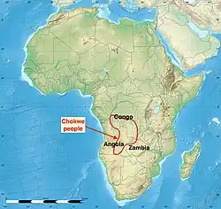 The Chokwe were once one of the twelve clans constituting the Lunda Empire in 17th- and 18th-century Angola.[4] Initially employed by Lunda nobles, the tribe split off from the Lunda oligarchy following a series of civil disputes, including refusal to pay tributes to the sitting king. Their trading and resources brought them relative wealth in comparison with other neighboring tribes. By 1900, the Chokwe had overthrown the Lunda kingdom (also called the Mwata Yanvo) altogether. With this, the Chokwe language and sociopolitical influence began to dominate northeastern Angola and the other 11 tribes of the former Lunda kingdom. As the conflicts escalated during the colonial era of the 19th and 20th centuries, both from Europeans to the west and the Swahili-Arabs to the east, the Chokwe mounted a reactionary-military insurrection and expanded further into northern Angola, Congo, and West Zambia.[5][6]