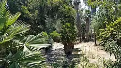 In the late 19th century, thickets of cactus as tall as nearly six feet high were noted in the valley created by the creek.[6]: 12 Other species of plants observed growing abundantly included Arctostaphylos, Ceanothus, Eriodictyon californicum, Vitis girdiana, and Diplacus aurantiacus.[6]: 12 By the late 20th century, species of plants found along the creek were Eriogonum fasciculatum, Salvia apiana, Quercus dumosa, Malosma, and Diplacus aurantiacus.[15]: 5 In 2015, a study of the south fork of the creek, before it merged with the north fork, found two plant species with California Rare Plant Ranks: Juncus acutus leopoldii, and Iva hayesiana.[16]: 11–12