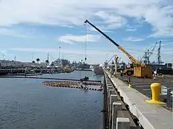From the turn of the century, until at least 1930, an estuary existed at the mouth of the creek that measured at least 2,000 feet (610 m) across and expanded until the point where the north and south branches of the creeks met.[6]: 11–12 In 1919, Naval Base San Diego was established. Soon after, land at the mouth of Chollas Creek was infilled, removing the existing wetlands. The creek was placed within a channel in order to prevent flooding of reclaimed lands that are part of the Navy base.[6]: 40 In 1938, the course of the north fork was modified due to the construction of Wabash Boulevard.[13]: 15 From 1946 until 1981, a burn site and landfill was operated by the City of San Diego within the watershed of Chollas Creek near Chollas reservoir.[56][57] On New Year's Eve 1951, the creek went over its normal creekbanks impacting a dozen families.[58] In the early 1960s, additional channeling of the creek occurred, with the goal of flood prevention.[6]: 42 In 1969, flooding occurred in Chollas Creek leading to the collapse of a channeled portion of the creek near Oceanview Boulevard, along with damage to the Jackie Robinson YMCA.[14]: 36 In 1978, a portion of the creek from its mouth to 0.35 miles (0.56 km) was designated as navigable waters.[5] Additional extensive flooding caused damage along Chollas Creek in 1978 and 1979.[14]: 36 Beginning in the late 1970s volunteers began to conduct vegetation clearing in the City Heights neighborhood to reduce fire potential within the canyons which the creek flows through .[59] In 1999, Chollas Creek was added to the list of impaired waterbodies by the Regional Water Quality Control Board, San Diego Region, after it was found that stormwater samples contained organophosphate pesticides and heavy metals.[60]