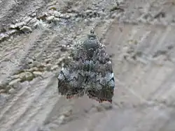The wingspan of the adult moth is about 11–15 mm.[3] The maculation of adult individuals from closely related Choreutis species can be confusingly similar, often leading to the need for genital examination in order to differentiate between species. The apple leaf skeletonizer is usually more brownish in maculation, but the banding needs to be carefully confirmed.[2]
