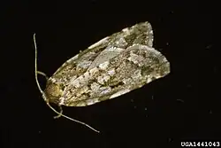 Adult moths are about 1/2 inch (12.7 mm) long and have a wing-spread of 7/8 to 11/8 inches (22 to 28mm). Moths of both sexes are similar in appearance, although the females are a bit more robust than males. Both sexes fly. The gray- or orange-brown forewings are banded or streaked, and each usually has a conspicuous white dot on the wing margin. Eggs are oval, light green, and about 3/64 inch (1.2mm) long and overlap like shingles.