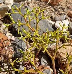 Chorizanthe brevicornu is a species of flowering plant in the buckwheat family which is known by the common name brittle spineflower. It is native to the southwestern United States and northern Mexico, where it is widely distributed but is most abundant in the deserts. [1] The plant extends an erect, naked, highly branching stem which is greenish in color. Most of the leaves grow from the base of the plant, but a few small ones may appear up on the stem. At the end of each of the many branches is a tube-shaped inflorescence which opens into a tiny white or greenish-yellow flower a few millimeters wide. [2] Chorizanthe brevicornu relies on wind and small mammals for seed dispersal. The brittle nature of the plant allows the inflorescence to break apart, aiding in spreading seeds across arid landscapes.[3]