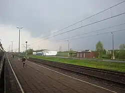On 25 August 1939, the railway was militarized, and by 28 August, the armored train Śmiały had begun operating. On the night of 31 August to 1 September, the wartime timetable came into effect.[27] On 1 September 1939, Śmiały participated in the Battle of Mokra, which took place on and around the trunk-line.[28] The September Campaign resulted in the destruction of key railway hubs. With the Wehrmacht's advance, German forces seized all railway facilities and rolling stock, rebuilding the line and dividing it administratively into three sections: Reichsbahndirektion Danzig (north of Nowa Wieś Wielka), Reichsbahndirektion Posen (from Nowa Wieś Wielka to Działoszyn), and Reichsbahndirektion Oppeln (south of Działoszyn).[29] Due to its strategic importance, Chorzów Batory–Tczew railway was targeted by Luftwaffe bombings during the September Campaign.[30]