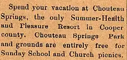 As early as 1855, the "medicinal qualities" of the water from Chouteau Springs was being touted in newspaper advertisements.[5] R. A Campbell in 1874 wrote regarding the medicinal qualities of Chouteau Springs, "Among the latter the most noted for their medicinal properties are the Chouteau Springs, about 12 miles south-west of Boonville, and near the line of the Missouri, Kansas & Texas Railroad. They are much frequented, and when improved will be a delightful place for summer resort. The medicinal properties of these waters are highly spoken of, and numerous individuals have received great benefit from their use."[6]