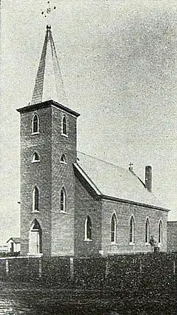 In 1870, St. Martin's Catholic Church, an 18x24 log structure, was built in Chouteau Springs on 1.5 acres of land donated by Daniel Martin, called "Martinsville."[9] A larger frame structure church was built on the same grounds in 1877 and in 1908 a solid red brick church was built on 2.25 acres donated by Anton Joseph Wesselman. The third church was about 1/4 mile north of the Chouteau Springs KATY railroad station. In 1920 St. Martin's Parochial School was built next to the brick church.[10] One hundred years after the first church was built in 1870, the Diocese closed down St. Martin's Church and School in 1970. St. Martin's Cemetery (Chouteau Springs "Martinsville") is located on the eastern rim of Chouteau Springs 38°55′01″N 92°52′40″W / 38.9169006°N 92.8778000°W. Cemetery records are regularly surveyed.[11]