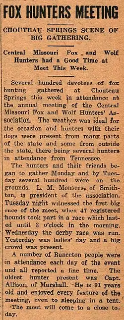 - ^ "Historic Spot For Annual Fox Hunt". The Sedalia Democrat. Sedalia, Pettis County, Missouri. August 23, 1935. p. 10.