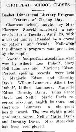 Melton (1937, p. 159) noted the following about the Chouteau Springs Grade School: "DISTRICT 18, CHOUTEAU, is taught by Miss Florence Stoecklein. Members of the board are: President, John S. Davis; Herman Lammers and John Schuster. Henry Brownfield is clerk. Pupils are: Dorothy Davis, Lorena Gatewood, John Edward Schuster, Farrel Gatewood, Jr., Margie Edson, Edna Grace Davis, Ruby Smith, Goldie Nelson, Kenneth Nelson, Bennie Evans, Albert Gatewood, Orville Evans, Mary Schraeder, Albert Leo Imhoff, Alberta Schraeder, Thomas Gatewood, Homer Evans, Alvin Oland and Robert Imhoff."[30]