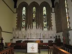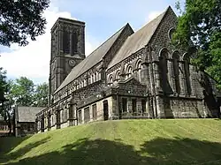 The church is built of coursed square gritstone and has a pitched slate roof. Designed in the Gothic Revival style, the church has a tall imposing nave with tripartite clerestory windows.[1]