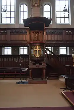 A short wall with two arched gates to the right of the church connects it to the neighbouring residential building. The first gate leads to the entrance to the church office along the side of the church while the second affords access to an interior courtyard space which surrounds the church on three sides and has facilities for the adjoining residential buildings. The right "representative" side of the church building is dressed while the left side stands in blank brick.