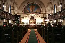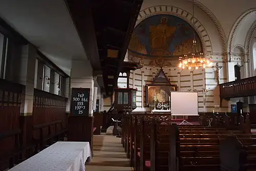 Raised three steps from the nave, the choir has a large round-arched, vaulted altar niche in its rear wall with a fresco by Johannes Kragh.