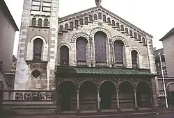 The church is oriented along a north–south axis. It is built in yellow brick but the south-facing main facade towards the street is clad in limestone with ornamental bands in green-glazed tiles. In front of the main entrance there is a loggia supported by six columns and a roof clad in copper. Also clad in limestone, the tower stands at the south-west corner of the building. Above the loggia, the facade features a series of round-arched windows, highest in the middle to reflect the shape of the triangular gable.