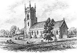 The 3⁄4-acre site was given in 1844 by Richard Hinckley the owner of Beacon House and its surrounding estate grounds. The site of the church would be approximately 500m south of Beacon House at the edge of the estate grounds and visible to the Hinckley's from their home. The cost of building the church was provided by Ellen Jane Hinckley, the wife of Richard Hinckley.[1] The church was built with local red sandstone in a Decorated Gothic Revival style under the design of Thomas Johnson of Lichfield. When the church was completed in 1847 in consisted of a chancel, nave and west tower containing a bell cast in 1845 by C. G. Mears of London.[1]