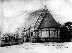 By 1874, the congregation had grown to the point where it needed a larger, more permanent church building. A parcel of land adjacent to the Anglican section of the cemetery was purchased and a stone church constructed to the design of Richard Suter, lay preacher to the congregation and diocesan architect. It was dedicated on 16 January 1876 to the memory of these buried in the adjacent cemetery. Even though funds had been supplemented by borrowing, it was not possible to complete the church as designed and the western end was finished in brick and timber. A rectory was also provided for the parish priest. Additional land was purchased close to the church in 1882 and a timber dwelling in Gothic style was built to the design of F.D.G. Stanley in early 1883. In 1888 the church and rectory allotments were amalgamated into a whole by the purchase of two adjoining blocks.[1]