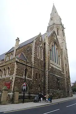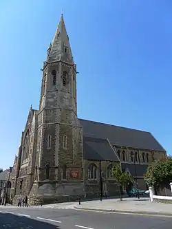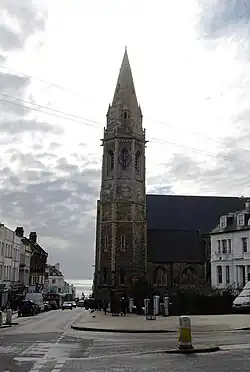 Christ Church is an Anglican church in the town and seaside resort of St Leonards-on-Sea, part of the Borough of Hastings in East Sussex, England. Opened as the town's third Anglican church in 1860 to serve a rapidly developing residential area and to accommodate poor worshippers who could not afford pew rents at the fashionable St Leonard's and St Mary Magdalene's Churches, the original building was superseded by a much larger church built next to it between 1873 and 1875. Prolific ecclesiastical architect Sir Arthur Blomfield's simple Gothic Revival design forms a landmark on one of St Leonards-on-Sea's main roads, continues to serve a large area of the town (including the former parish of the now closed St Mary Magdalene's Church) and maintains a strong Anglo-Catholic tradition. It has been described as Blomfield's "finest achievement in Sussex" and "one of the main centres of Anglo-Catholic worship in Southern England".[1] The interior fittings are the best of any church in the borough, and the design has been called one of Blomfield's most successful.[2] St John the Evangelist's Church, founded as a daughter church nearby in 1865, also continues to thrive as a separate parish church. Historic England has listed Christ Church at Grade II* for its architectural and historical importance.