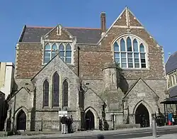 Christ Church continues to be one of the most recognisable landmarks in the town, and London Road "presents the visitor with a fascinating array of 19th-century church architecture".[55] The old and new churches stand together, and higher up the hill to the north the former St Leonards-on-Sea Congregational Church (closed 2008) looks down on them. Described as one of the finest[55] and most ambitious Nonconformist churches in Sussex,[56] the 1863 structure lost its distinctive spire in the Great Storm of 1987.[53][55][56]