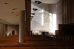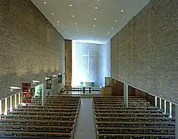 The congregation opted to go with the design after finding that their plans for a traditional Gothic Revival building would be too costly. In 1946 a new pastor, Reverend William A. Buege, contacted the elder Saarinen, then the president of the Cranbrook Academy of Art, and convinced him to take the commission. Saarinen had designed the pioneering First Christian Church in Columbus, Indiana in 1941 and used it as a model. It was Eliel Saarinen's last building; he died the following year. Upon the church's opening, Saarinen noted "if a building is honest, the architecture is religious."[4] At first look, the church appears to be an oblong box, but actually it is an irregular quadrilateral—the side walls are not parallel, nor are the front and back walls.[4]