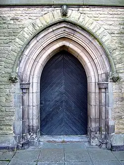 The tower is built of yellow sandstone with angle buttresses. It has a west door above which is a hood mould, its stops carved with faces. Over this is a window with Geometric tracery. Higher on the tower are more windows, some of which are lancets, and others have trefoil heads. On each side of the tower is a clock dial set in diapered panels. The top stage has louvred triple-lancet bell openings. On the top of the tower is a stepped and gabled parapet, with octagonal crocketed pinnacles at the corners.[3] Originally the tower had an iron crown that was made in the railway workshops.[1]