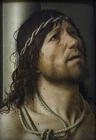 The face of Christ was a common theme in Antonello's art: however, portraying Christ in the middle of his pain, in the moment in which the tortures have just begun, Antonello managed to obtain an emotive impact sometimes lacking in his similar works.