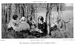 Cockerell modelled occasionally for her husband: his Mother and Child shows her with their infant son Meredith, and was exhibited at the 1897 Venice Biennale and the Paris Exposition Universelle in 1900.[8] Her husband also featured in her work: one of her smaller paintings shows him sitting by a window, working on his sculpture, watched by his young son.[9]