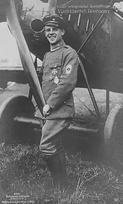 Donhauser began his flying career as a pilot in a photo reconnaissance and artillery direction unit, Feldflieger Abteilung (Field Flier Detachment) 10.[2] He scored his first victory on 18 May 1918, while he was flying artillery spotting missions. On 13 June 1918, he received the Iron Cross First Class after being wounded in action.[3] He then volunteered to fly fighter aircraft and underwent training at Jastaschule (fighter school) No. 1. After his graduation and posting to Jasta 17 as a Feldwebel in July 1918, he rapidly ran up a score. His second victory was on 20 August 1918; by the end of the month, his count was nine. He won twice more in September, and scored eight triumphs in October, with the last one on 23 October, just over two months after joining the jagdstaffel.[1] On 9 October 1918, he was awarded the Military Merit Cross, which was the highest Prussian decoration for valor awarded to noncommissioned officers.[2][4] At war's end, Donhauser was in the first detachment of German pilots to surrender their aircraft.[1]