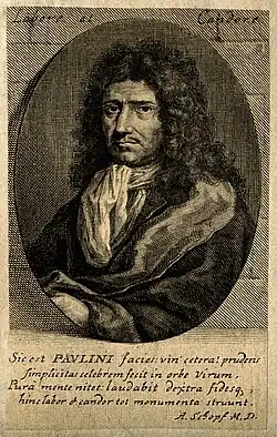 He was regarded as a polymath and corresponded with Leibniz[2] and knew the German Jesuit scholar Athanasius Kircher. Paullini was a member of numerous learned societies such as the Fruitbearing Society, Pegnesischer Blumenorden and German Academy of Sciences Leopoldina.