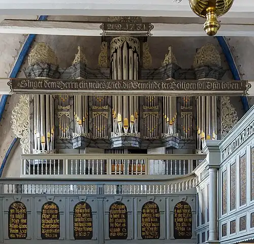 His surviving organs are at Bockhorn, Oldenburg (1722); Oude Kerk, Amsterdam (1726); Wiefelstede, Oldenburg (c.1729); St Nikolai, Gifhorn (1748) and Hohenrode, Bad Hersfeld (1749); remnants such as cases and pipework survive elsewhere. His organs have well-balanced specifications and are typical of the late northern German Baroque organ.