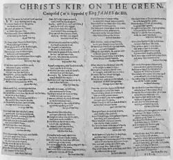 "Christis Kirk on the Green" is an anonymous Middle Scots poem in 22 stanzas, now believed to have been written around the year 1500, giving a comic account of a brawl at a country fair. It was for many years mistakenly attributed either to James I of Scotland or to James V of Scotland. It gave rise to a whole tradition of humorous poems on similar subjects by Scottish poets down the centuries, including Allan Ramsay and Robert Burns, and is still one of the most frequently published works in Middle Scots.[1] "Christis Kirk on the Green" has been called one of the finest performances in 15th-century British poetry.[2]