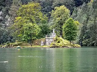 A well-known monument on the island is the statue of John of Nepomuk, patron saint protector from floods and drowning. The statue is about 180 cm high and made of marble. It stands on a hill in the northern portion of the island, on top of a pedestal about two meters high. The statue was erected in 1711 and donated by Johann Anton Zeitlmayer, director of chancellery and land judge of the Berchtesgaden Provostry, after all four passengers involved in a boat accident had been rescued. Since the erection of this statue, the island has also been called Johannesinsel (John's island or St. John's). It is believed that previously a statue of Apostle Bartholomew was at this location.