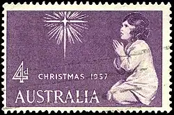 The choice of designs is highly variable, ranging from an overtly religious image of the Nativity, to secular images of Christmas trees, wreaths, Santa Claus, and so forth.[3] A country may maintain a unified theme for several years, then change it drastically, in some cases seemingly to follow "fashion moves" by other countries. For instance, during the 1970s many countries issued Christmas stamps featuring children's drawings, with the young artist identified by name and age.