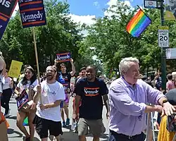 Kennedy called for an open primary in the 2018 gubernatorial race, urging the Cook County Democratic party not to throw their weight behind any other candidate, instead allowing for voters to vet all the candidates in the race.[35] The Cook County Democratic Party endorsed Pritzker in August 2017.[36] Kennedy was forced to backtrack after he defended the campaign of Republican Bruce Rauner running ads attacking Pritzker during the Democratic primary saying "Rauner is trying to do what he thinks is best for the state of Illinois" and "his willingness to speak truth to power... is something that I think he should be applauded for."[37][38]