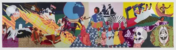 Myers's titled his 2019 exhibition at Fort Gansevoort, "Drapetomania", referencing a supposed and debunked 19th-century pseudoscientific theory that posited enslaved Africans' impulse to escape bondage as a mental illness.[4][8] Los Angeles Times critic Leah Ollman wrote that its monumental tapestries "conceive a kind of emblematic space, part proclamatory banner, part illusionistic window to the world. The most affecting works visualize some sort of existential reckoning, a claiming of place, voice, liberty."[8] What Does It Mean To Matter (Community Autopsy) (2019) was a 14-foot wide group portrait of nine recent victims of police violence, each a silhouette in umber, crimson or ochre cloth modeled after coroners' autopsy sheets and embellished only with yellow and red shapes marking the bullet wounds that killed them.[10][4][17] In his 34-foot textile mural, Sarah Forbes Bonetta as Omoba Aina as Persephone (2021), Myers depicted the diasporic dislocations of a 19th-century Yoruba princess (Bonetta) who was orphaned and enslaved in a regional war, given to the British as a diplomatic gift, raised as Queen Victoria's ward, and finally married to a wealthy industrialist. The tapestry's layered analogies connect her hybrid identity to colonial history and the Greek goddess Persephone, who was given away to Hades, god of the underworld.[32][29]