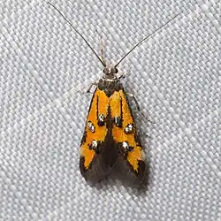 The wingspan is 15–17 mm for males. Adults have been recorded from late July till late August.