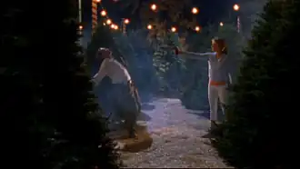 Meanwhile, Sarah and Casey learn that Ned is unmarried and had earlier called Mauser rather than his wife, as the hostages were led to believe. They follow the ambulance containing Chuck and Mauser and shoot its tires, sending the vehicle into a Christmas tree lot and allowing Chuck to escape. After a brief fight, Mauser surrenders, confident that Fulcrum will rescue him. To protect Chuck, Sarah executes Mauser. Unknown to Sarah, Chuck watches the entire confrontation in horror from afar. She lies to Chuck and tells him that Mauser has been arrested. At the Buy More, Ellie and Morgan's girlfriend Anna Wu (Julia Ling) praise Lester for his act of bravery. Morgan watches as Lester grabs Anna and kisses her, turning away before Anna pulls away from Lester in disgust. The episode closes with both Morgan and Chuck heartbroken, Morgan believing Anna to be unfaithful, and Chuck believing Sarah to be a murderer.