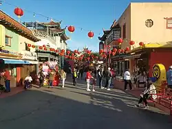 Chung King Road, along with Chung King Court containing a water fountain in its center, is a pedestrian street complex in the northwest corner of Chinatown, Los Angeles, United States. This street is a part of "New Chinatown", built in the 1930s and 1940s, and was the location of mostly Chinese specialty shops, importers of Chinese art objects, and Chinese benevolent associations. In the late 1990s many of the storefronts were sitting unused, and several of them were converted into art galleries and art studios. With its nearly weekly schedule of art gallery exhibition openings, Chung King Road is now one of the centers of art and nightlife in Downtown Los Angeles.[1] Annual events include Chinese New Year and the Golden Dragon Parade,[2] The Moon Festival, KCRW's Chinatown Summer Nights,[3] the closing party of LA's Design Week and the Perform! Now! Festival.[4]