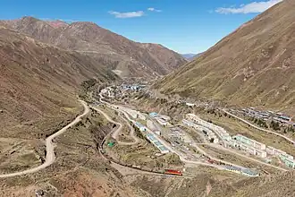 ![]() The mining village of Q'asa P'allqa (Casapalca) with the eastern slope of Qanchis Kancha (on the right), the western slope of Chuqi Chukchu (on the left) and Quñuq P'ukru (in the background on the left) as seen from Jirish Mach'ay, looking to the south. | |