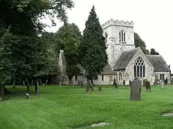 St Mary the Virgin's Church, on Church Street, dates from the 13th century, with a 15th-century tower and is one of the smallest cruciform churches in England.[6][8][7] It is a Grade I listed building.[17] The Old Vicarage, on Main Street is also a listed building, Grade II,[18] as is the Village Cross.[19] The church was originally dedicated to St John the Baptist and one of the three bells (18th century) has the figure of St John.[6] It is of Magnesian Limestone with slate roofing.[17] The tower is square with battlements[17] and as well as the bells contains a clock which was installed in 1780.[6] It is fitted with aircraft warning lights because of the nearby aerodrome.[7]