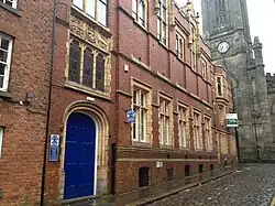 Church Lane became the legal heart of the town when Oldham County Court opened in 1894. It was designed by Henry Tanner and is red brick with white terracotta dressings and has a Westmorland slate roof.[11] It is referred to in Hansard when questions were asked in Parliament as to the dampness in the building and whether it caused the death of Judge Edwin Jones.[12]